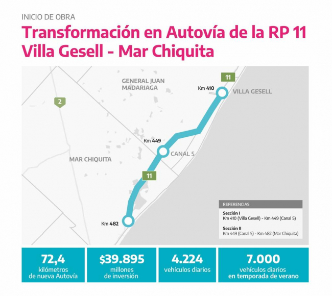 En este sentido, la obra se realizará en dos secciones sobre el margen noroeste de la ruta: desde la rotonda de acceso a Villa Gesell hasta el Canal 5 (39,4 km) y desde el Canal 5 hasta Mar Chiquita (33 km).